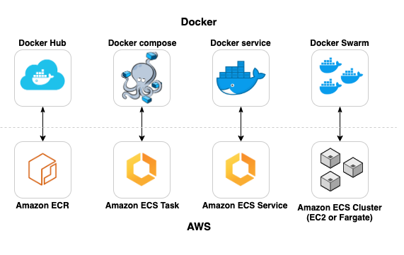 At start, I’ve wasted quite some time just to understand how are all services on AWS ECS related to Docker. For those who are familiar with Docker, here are the direct mappings between AWS and Docker technologies.