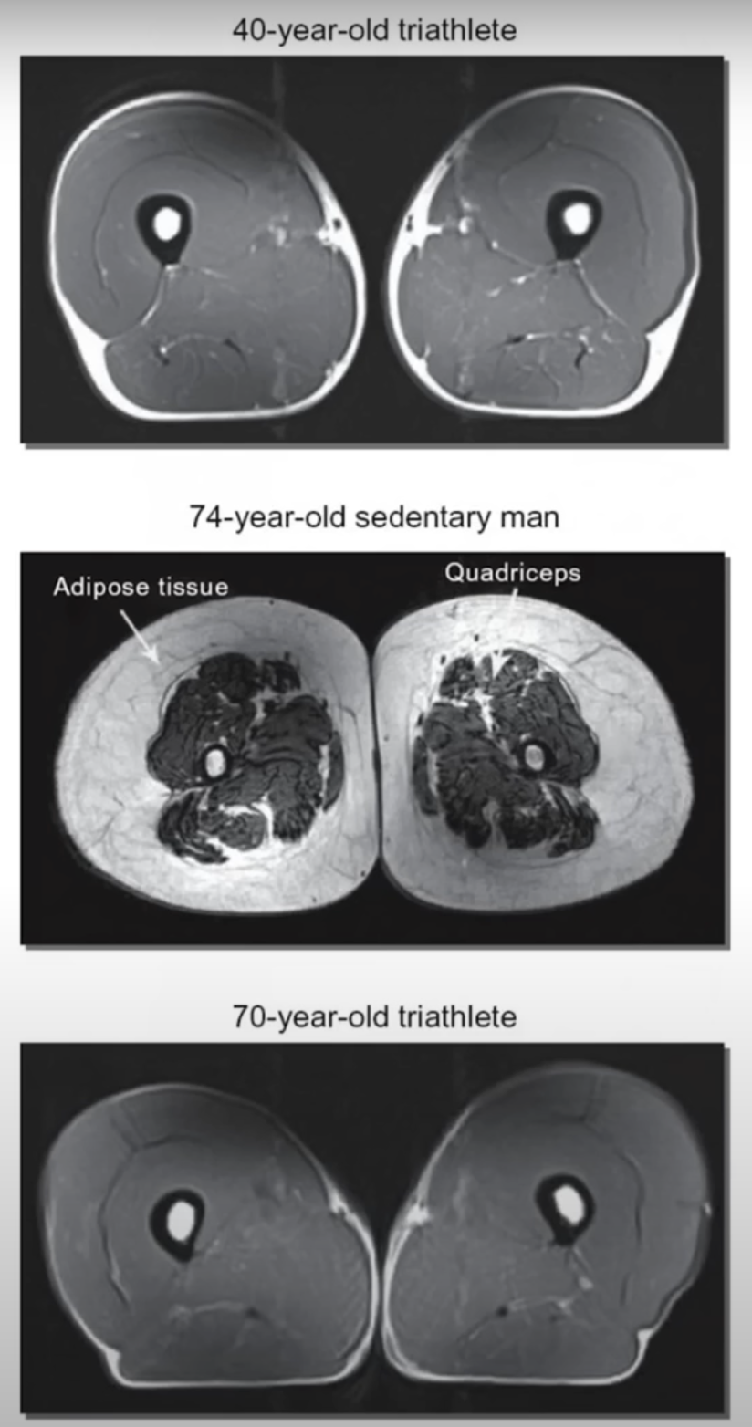 And from this we can clearly see the 70-year-old triathlete has almost perfect muscle while that of the 74-year-old sedentary man is almost unrecognizable.
